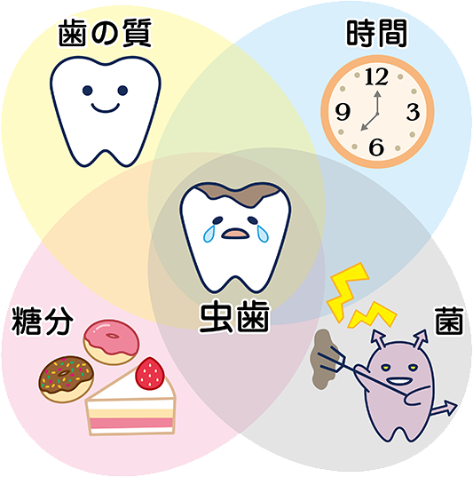 むし歯は、歯質・細菌・食べ物糖分 の 3 つに「時間の経過」が加わることで、むし歯になります。